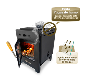 • Utiliza un sistema de ingeniería con recirculación de aire que ayuda a mantener el vidrio limpio de cenizas y evita la fuga de humo cuando se abre la puerta para su recarga.