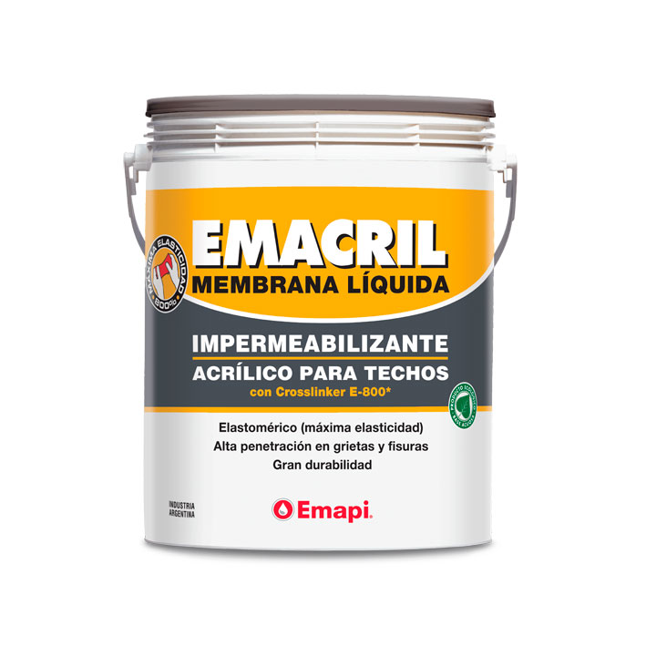 Producto ecológico, impermeabilizante elastomérico para techos, de formulación acrílica, para uso exterior. Increíblemente elástico, con excelente resistencia a factores climáticos adversos y a la radiación UV. Su consistencia cremosa lo hace un recubrimiento de fácil aplicación. Su estudiada plasticidad, permite emprolijar la superficie durante el secado. Cuando seca, produce una membrana impermeable, de gran adherencia al sustrato y resistencia mecánica. Altamente durable.Indicado para todo tipo de techos, horizontales, de gran pendiente o abovedados y terrazas (de tránsito moderado); sean de cemento, fibrocemento, baldosas, cerámica no esmaltada, membranas asfálticas con terminación de poliéster, o similares. *Crosslinker E-800 es un desarrollo nacional –de base elastomérica– del Departamento de I+D de la División Pinturas de Emapi S.A. Como respuesta del producto aplicado se obtiene una membrana de alto poder cubritivo con un elevado índice de elasticidad isótropo (multidireccional), y gran adherencia al sustrato, resistente a exigencias climáticas adversas (lluvia y altas temperaturas –y sus consecuencias: movimientos de contracción y dilatación del sustrato–).